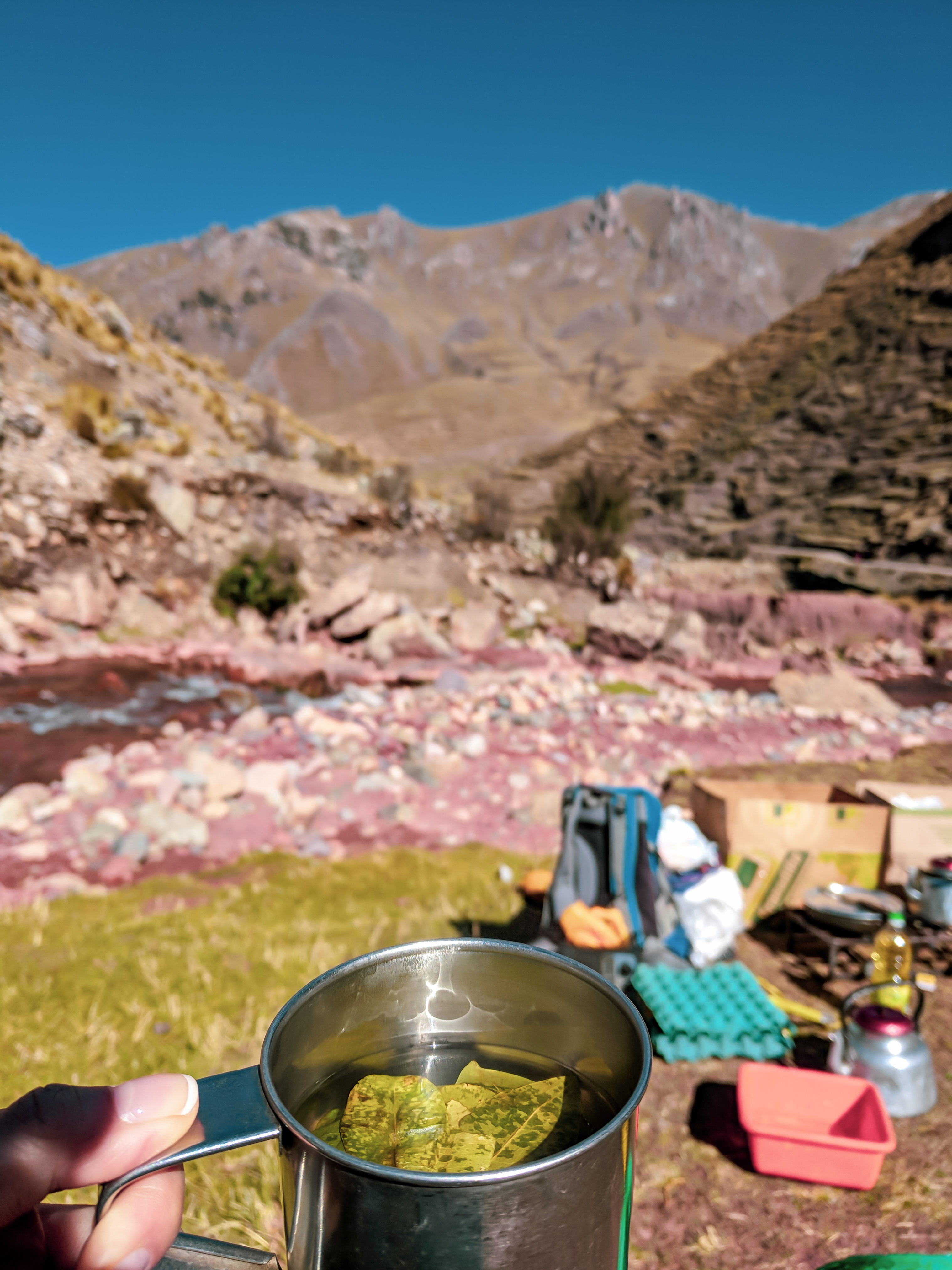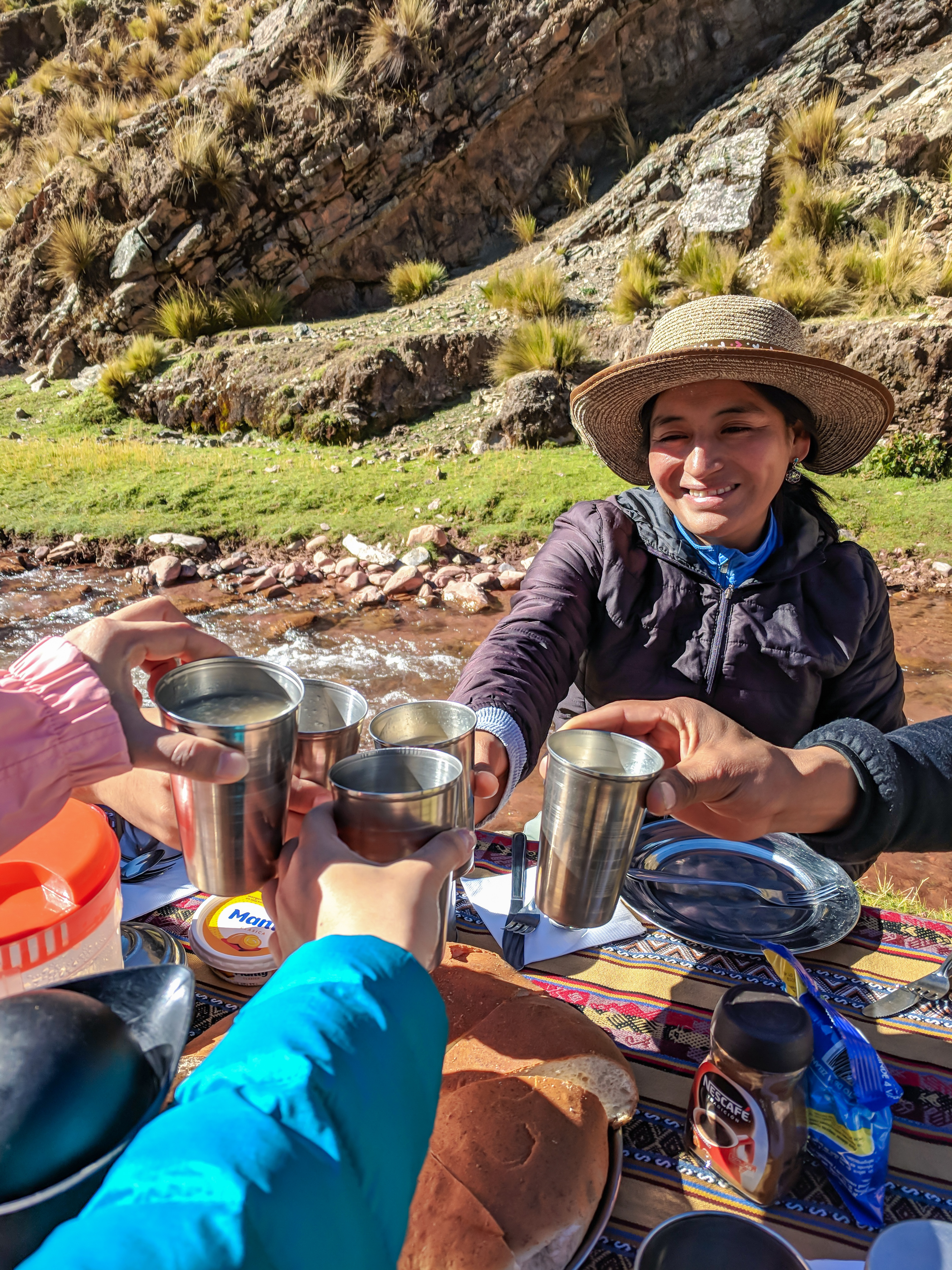 开往彩虹山的路上,我们沿河而憩,坐在河边吃早饭。周围是小溪流动的声音,鸟儿哼着小调儿,喝上一杯刚泡好的古柯叶茶(可以帮助缓解高原反应)。厨师递上一杯温暖香甜的藜麦粥,旁边锅里的炒蛋还在滋啦滋啦地作响。不远的山上有漫山遍野的草泥马悠闲地吃着草,话说草泥马真的是爬山高手,多高的山都不在话下。这样的清晨,突然理解隐士为什么会选择隐居深山,远离江湖了。